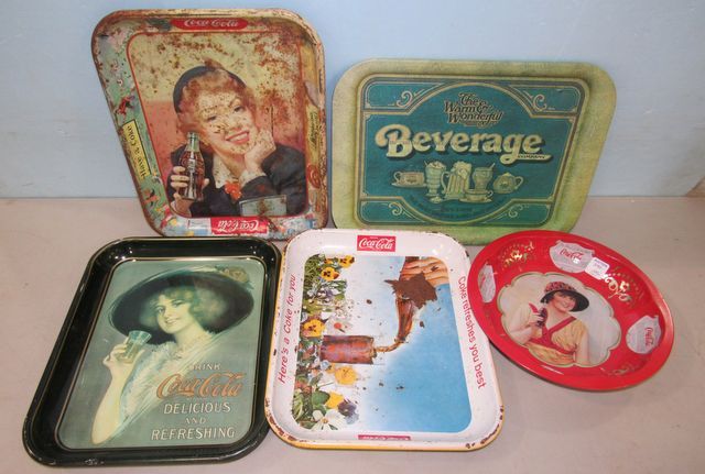 Red reproduction 1995 Coca-Cola bowl 10"dia., Black Coca-Cola tray 13" x 10", Vintage Coca-Cola worn tray, White vintage Coca-Cola worn tray, The Warm & Wonderful Beverage Tray Red reproduction 1995 Coca-Cola bowl 10"dia., Black Coca-Cola tray 13" x 10", Vintage Coca-Cola worn tray, White vintage Coca-Cola worn tray, The Warm & Wonderful Beverage Tray