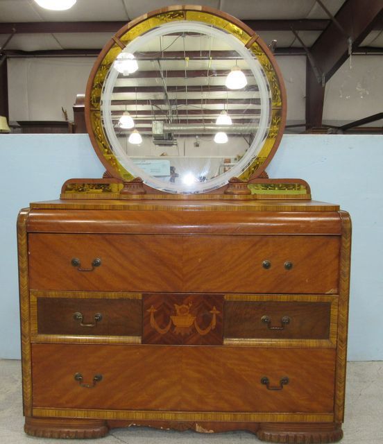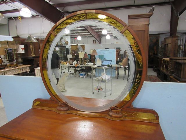 Etched round mirror (has veneer trim missing), has the pull in drawer, 36"h., 48"w. Etched round mirror (has veneer trim missing), has the pull in drawer, 36"h., 48"w.