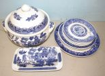 Five blue and white saucers, three dessert plates, one salad plate, Churchill Staffordhire butter dish, Churchill Staffordhire tureen, 4"h., 9"w. Five blue and white saucers, three dessert plates, one salad plate, Churchill Staffordhire butter dish, Churchill Staffordhire tureen, 4"h., 9"w.