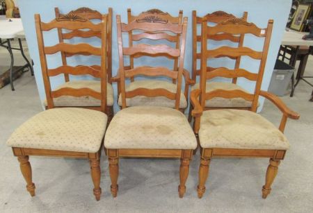 Two arm chairs, four side chairs, upholstery is stained on seats, ladder back, 43"h. Two arm chairs, four side chairs, upholstery is stained on seats, ladder back, 43"h.