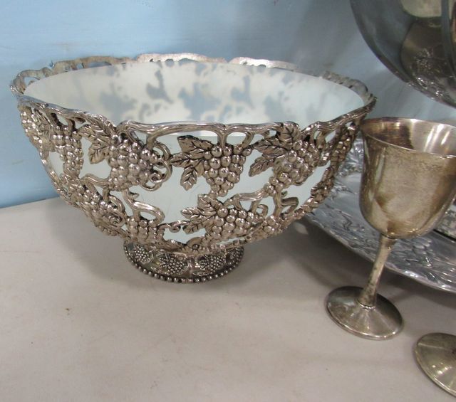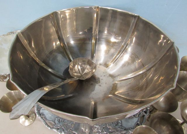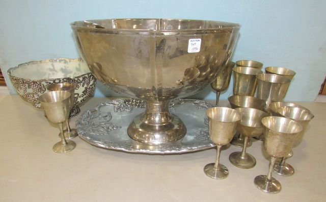 Four gallon punch bowl 12"h., 16"dia., thirteen silver plate goblets, ladle, underplate, pedestal cut-out serving bowl in glass inset 6"h., 10"dia. Four gallon punch bowl 12"h., 16"dia., thirteen silver plate goblets, ladle, underplate, pedestal cut-out serving bowl in glass inset 6"h., 10"dia.