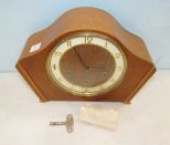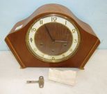 Glass door, has key and pendulum, untested minor wear, 9"h., 13"w. Glass door, has key and pendulum, untested minor wear, 9"h., 13"w.