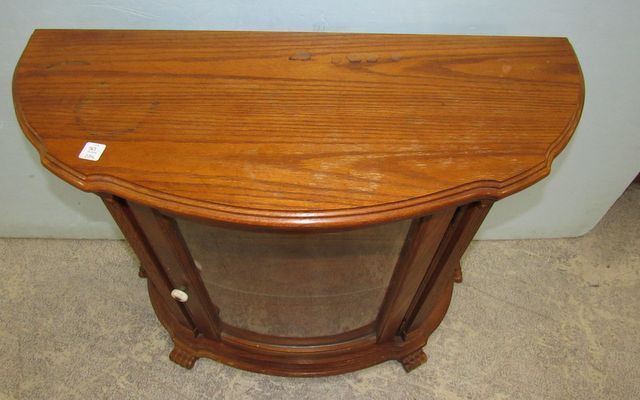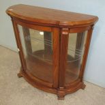 One glass shelf, four feet, bow glass door and side panels, lighted, 29"h., 33"w., 19"d. One glass shelf, four feet, bow glass door and side panels, lighted, 29"h., 33"w., 19"d.