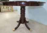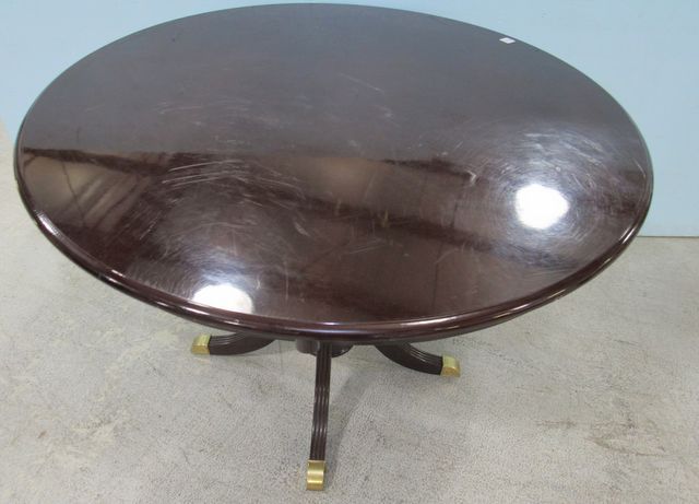 Brass cap feet, has scuff and scratches on top, 30"h., 42"dia. Top is removable. Brass cap feet, has scuff and scratches on top, 30"h., 42"dia. Top is removable.