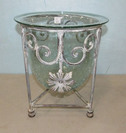 Crackle glass bowl, white painted metal frame, 15"h., 12"dia. Crackle glass bowl, white painted metal frame, 15"h., 12"dia.