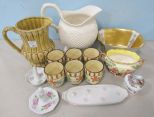 Japanese glazed pottery pitcher 6"h., cardinal porcelain pitcher (has hair line crack) 8"h., gold hand painted concorde china bowl 3"h., 7'w., Japanese hand painted mini urn 3"h., 6"w., six hand painted Japan cups 3"h., Ucagco ceramic dish, Limoge french trinket box. Japanese glazed pottery pitcher 6"h., cardinal porcelain pitcher (has hair line crack) 8"h., gold hand painted concorde china bowl 3"h., 7'w., Japanese hand painted mini urn 3"h., 6"w., six hand painted Japan cups 3"h., Ucagco ceramic dish, Limoge french trinket box.