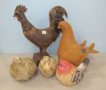 Terra Cotta bird planter, new tin rooster, three painted resin birds. Terra Cotta bird planter, new tin rooster, three painted resin birds.
