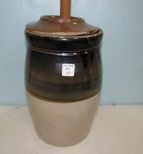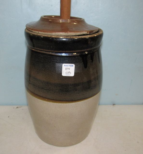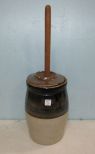 Has lid, stick, glazed, crock is 12"h. Has lid, stick, glazed, crock is 12"h.