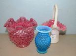 Pink hobnail crimped vase 4"h.,5"w., blue hobnail vase 4"h., fenton style basket (is damaged with a crack) 6"h. Pink hobnail crimped vase 4"h.,5"w., blue hobnail vase 4"h., fenton style basket (is damaged with a crack) 6"h.