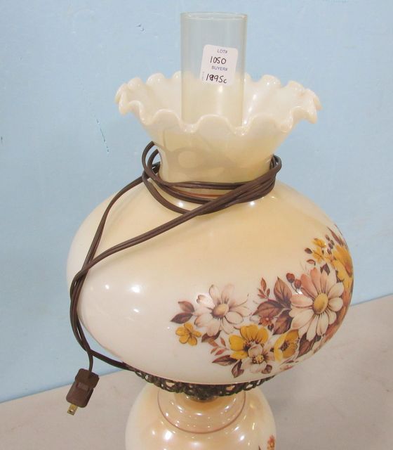 Hurricane shade, hand painted floral patterns, ornate brass frame and trim, electrified, 23"h. Hurricane shade, hand painted floral patterns, ornate brass frame and trim, electrified, 23"h.