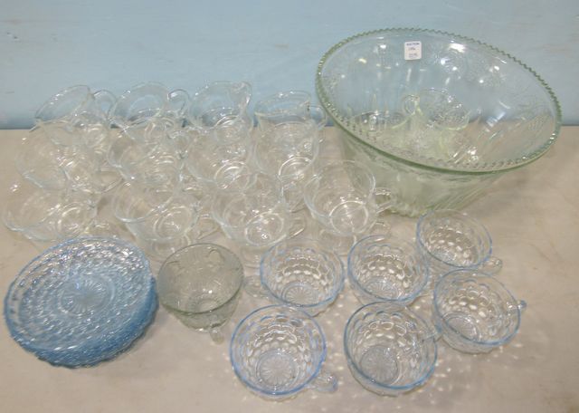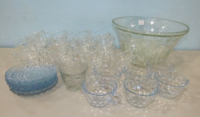 Grapevine punch bowl with five matching cups, 24 punch cups, seven blue bubble glass saucers, six blue bubble glass cups. Grapevine punch bowl with five matching cups, 24 punch cups, seven blue bubble glass saucers, six blue bubble glass cups.