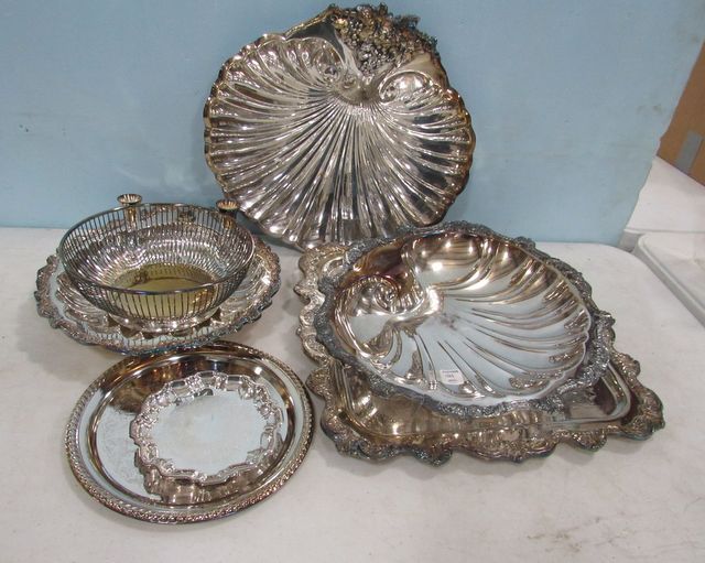 Some plate is pealing off, 1965 monogrammed tray 17"sq., Poole old english shell dish (pealing on edges) W.M. Rogers plate, English silver dish, Fisher basket, Countess shell serving dish, Reed and Barton Shell Dish. Some plate is pealing off, 1965 monogrammed tray 17"sq., Poole old english shell dish (pealing on edges) W.M. Rogers plate, English silver dish, Fisher basket, Countess shell serving dish, Reed and Barton Shell Dish.