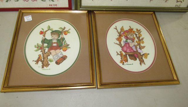 Two handmade samplers 17" x 20", two small hummel needleworks 11" x 12". Two handmade samplers 17" x 20", two small hummel needleworks 11" x 12".