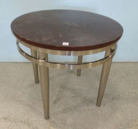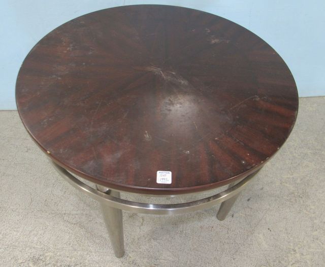 Laminate wood top, worn, chrome metal frame, 23"h., 26"dia. Laminate wood top, worn, chrome metal frame, 23"h., 26"dia.