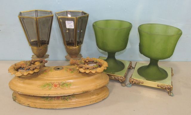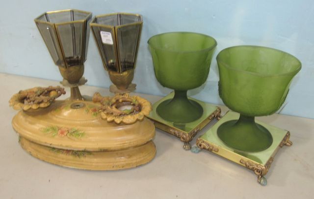 Pair of green depression style glass candle holders with brass footed bases 8"h., pair of brass beveled glass candle holders, tinted glass 9"h., two vintage light fixture ceiling plates with finials. Pair of green depression style glass candle holders with brass footed bases 8"h., pair of brass beveled glass candle holders, tinted glass 9"h., two vintage light fixture ceiling plates with finials.