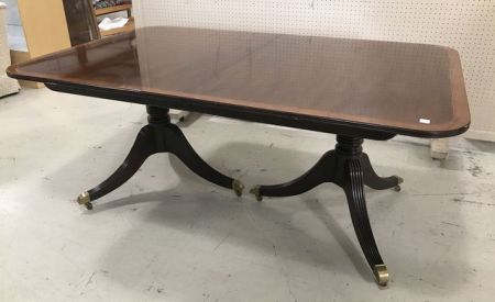 Baker Furniture Double Pedestal Banded Dinning Table, banded border with inlay trim, double pedestal, brass casters, three leaves, legs are not removable, 29"h., 68"long, 44"w. Baker Furniture Double Pedestal Banded Dinning Table, banded border with inlay trim, double pedestal, brass casters, three leaves, legs are not removable, 29"h., 68"long, 44"w.