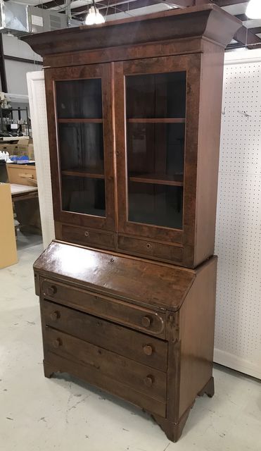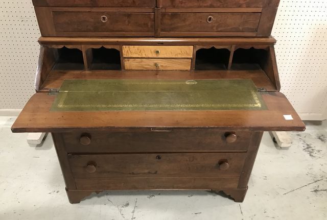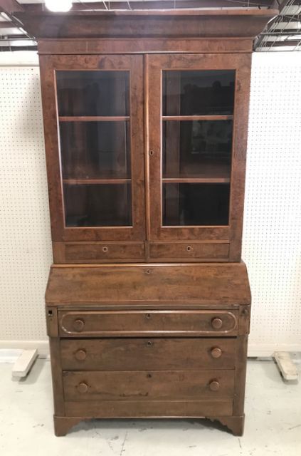 Antique Victorian Secretary Bookcase, two piece, double glass door bookcase with two shelves, two drawers, drop front desk, three bottom drawers, dove tailed, average condition, top needs back supports, has key, 83"h., 40"w., 19"d. Antique Victorian Secretary Bookcase, two piece, double glass door bookcase with two shelves, two drawers, drop front desk, three bottom drawers, dove tailed, average condition, top needs back supports, has key, 83"h., 40"w., 19"d.