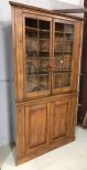Antique Bookcase Corner Cabinet, two piece, double glass door top, missing some glass panels, three shelves, double door base storage, 83"h., 43"w., 22"d. Antique Bookcase Corner Cabinet, two piece, double glass door top, missing some glass panels, three shelves, double door base storage, 83"h., 43"w., 22"d.