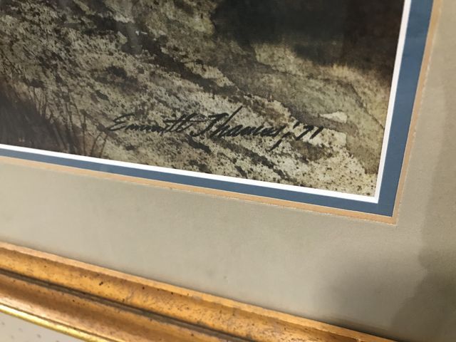 Framed Emmitt Thames Print, frame at Browns, "Old Wood House", frame is 33"h., 40"w. Framed Emmitt Thames Print, frame at Browns, "Old Wood House", frame is 33"h., 40"w.