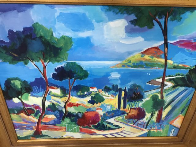 Seaside oil painting on board, gold gilt Nebletts framed, unsigned, pretty colors, 32"h., 38"w. Seaside oil painting on board, gold gilt Nebletts framed, unsigned, pretty colors, 32"h., 38"w.