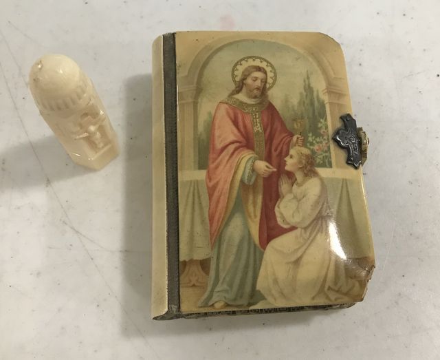 Celluloid Prayer Book 4"h. and Holy Water Container. Celluloid Prayer Book 4"h. and Holy Water Container.