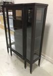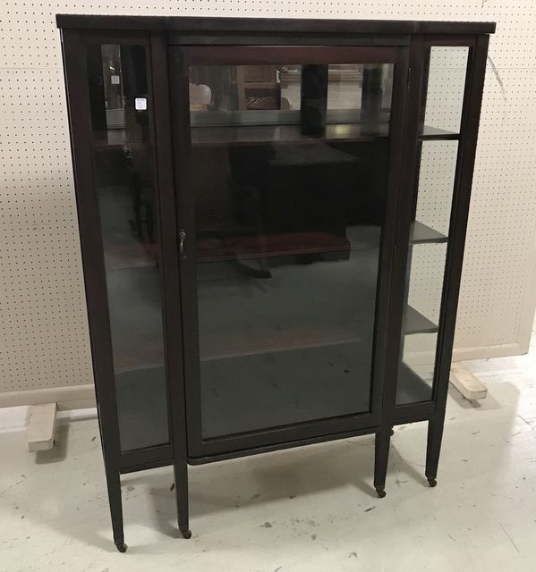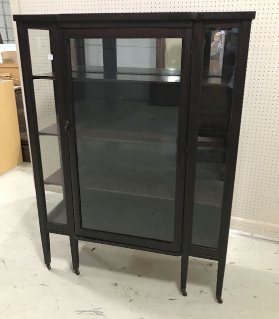 J.B. Van Sciver Co. Vintage Curio Cabinet, American, glass panels, single door with push button latch, wood display shelves, dark finish, mirrored top back, on casters, 60"h., 45"w., 15"d. J.B. Van Sciver Co. Vintage Curio Cabinet, American, glass panels, single door with push button latch, wood display shelves, dark finish, mirrored top back, on casters, 60"h., 45"w., 15"d.