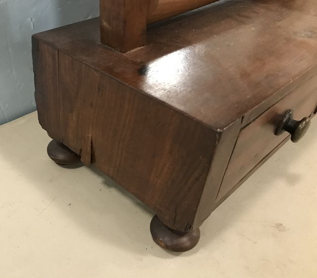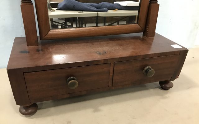 Antique Dresser Top Shaving Mirror Stand, two drawers, mahogany, some veneer missing, footed, 24"h., 18"d., 8"d. Antique Dresser Top Shaving Mirror Stand, two drawers, mahogany, some veneer missing, footed, 24"h., 18"d., 8"d.