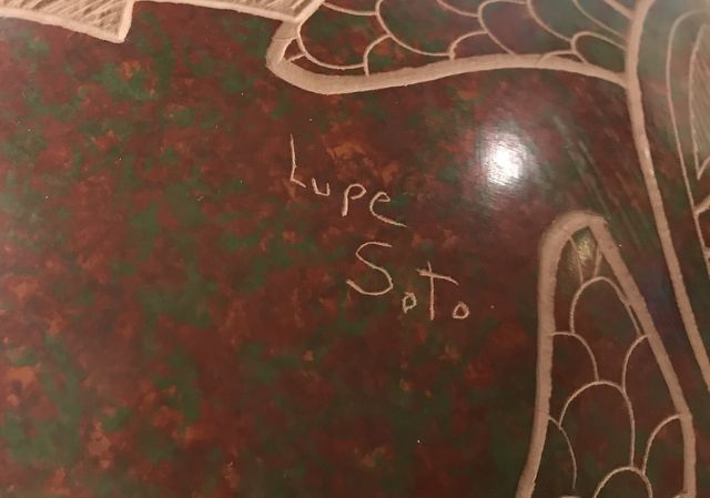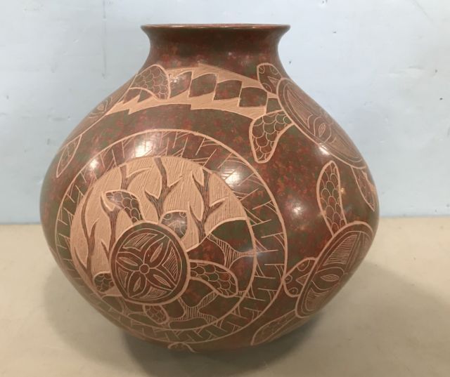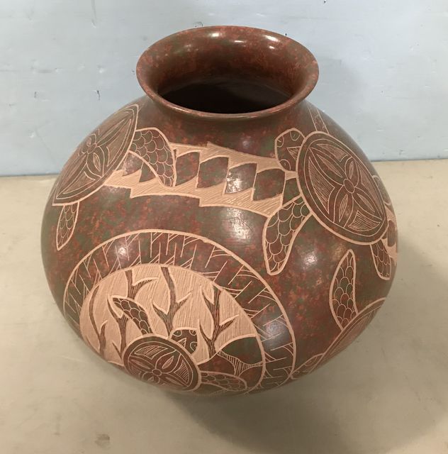 World famous Mata Ortiz pot, hand made by pinching and coil method, geometric designs, hand painted, Olla pot, Sea Turtle image, made for artwork/decor, popular in Santa Fe, NM. Black finish, signed Lupe Toto, retail is 500.00, 11"h., 10"dia. World famous Mata Ortiz pot, hand made by pinching and coil method, geometric designs, hand painted, Olla pot, Sea Turtle image, made for artwork/decor, popular in Santa Fe, NM. Black finish, signed Lupe Toto, retail is 500.00, 11"h., 10"dia.