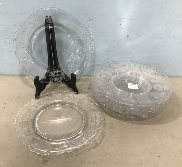 Rose point glass plates, 8 plates total, 8"dia. Rose point glass plates, 8 plates total, 8"dia.