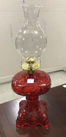 New Reproduction Oil Lamps, red with clear glass shade, B & P company, 12"h. New Reproduction Oil Lamps, red with clear glass shade, B & P company, 12"h.