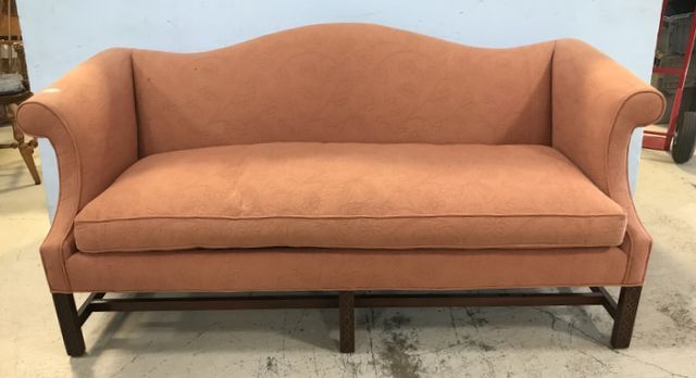 Hickory Chair Chippendale Camel Back Sofa, Chippendale style base, peach like fabric color, single cushion, 31"h., 72"L. Hickory Chair Chippendale Camel Back Sofa, Chippendale style base, peach like fabric color, single cushion, 31"h., 72"L.
