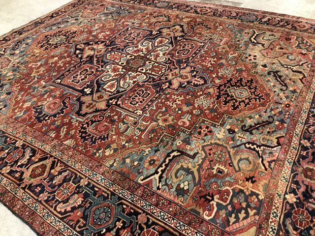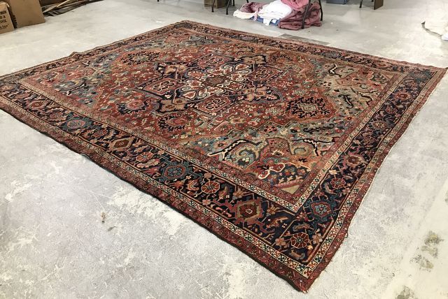 Large Antique Low Pile Persian Area Rug, hand knotted, wool, good condition, but needs cleaning ( has smell), 12'10 x 11'2. Large Antique Low Pile Persian Area Rug, hand knotted, wool, good condition, but needs cleaning ( has smell), 12'10 x 11'2.