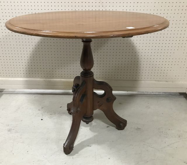 Victorian Style Tilt Top Parlor Table, round top, pedestal carved base, latch needs adjusting, 33"dia., 29"h. Victorian Style Tilt Top Parlor Table, round top, pedestal carved base, latch needs adjusting, 33"dia., 29"h.