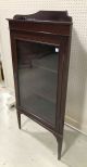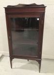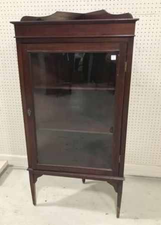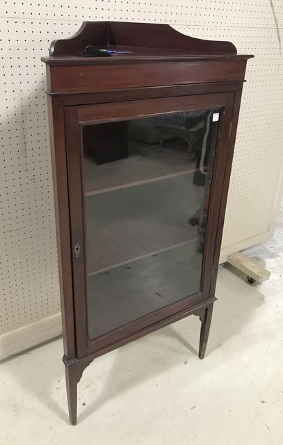 Vintage corner curio with single glass door, two wood display shelves, dark mahogany, unique size, top gallery border, has some finish wear, comes with key, 54"h., 28"w., 15"d. Vintage corner curio with single glass door, two wood display shelves, dark mahogany, unique size, top gallery border, has some finish wear, comes with key, 54"h., 28"w., 15"d.