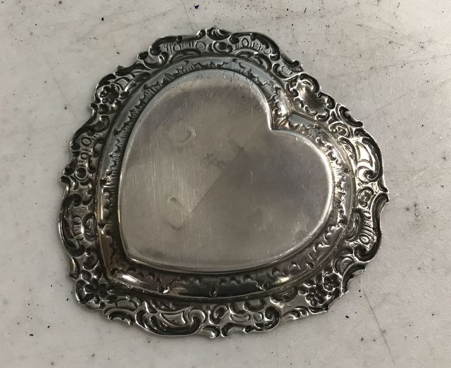 Small English Sterling Heart Nut Dish, Hallmarks, Birmingham, Anchor, loin, E. Ornate border, 3"w., 3"d. Small English Sterling Heart Nut Dish, Hallmarks, Birmingham, Anchor, loin, E. Ornate border, 3"w., 3"d.
