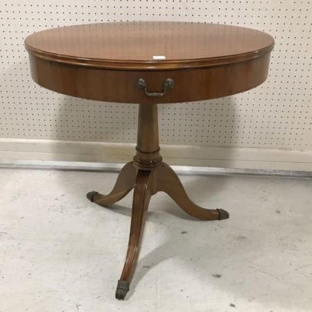 Vintage Duncan Phyfe Drum Table, single drawer, pedestal base, brass claw, mahogany, good condition, 27"h., 28"dia. Vintage Duncan Phyfe Drum Table, single drawer, pedestal base, brass claw, mahogany, good condition, 27"h., 28"dia.