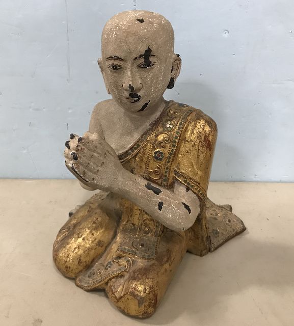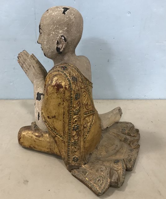 Antique Hand Carved Buddha, wood carved, gold gilt painted, has age wear, 14"h., 10"d. Antique Hand Carved Buddha, wood carved, gold gilt painted, has age wear, 14"h., 10"d.