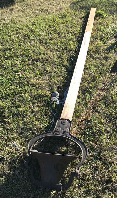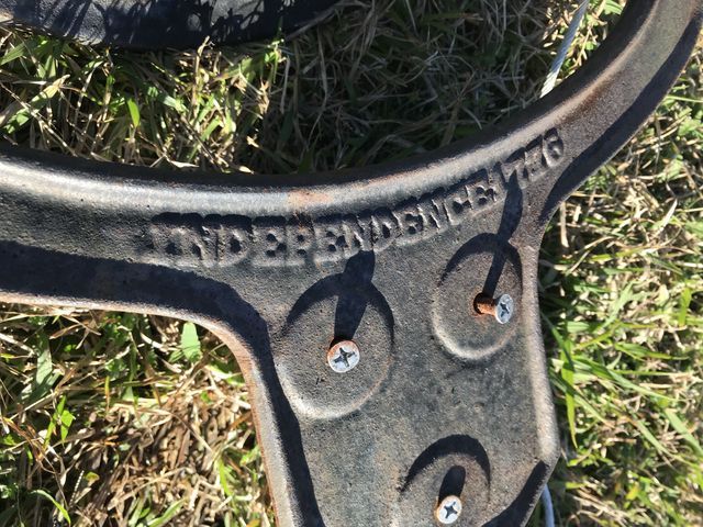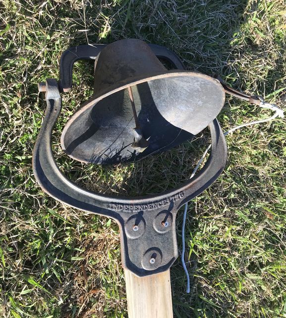 Vintage iron dinner bell (Independence 1776 commemorative hallmark) all parts there, mounted on a long 4 x 4. Vintage iron dinner bell (Independence 1776 commemorative hallmark) all parts there, mounted on a long 4 x 4.