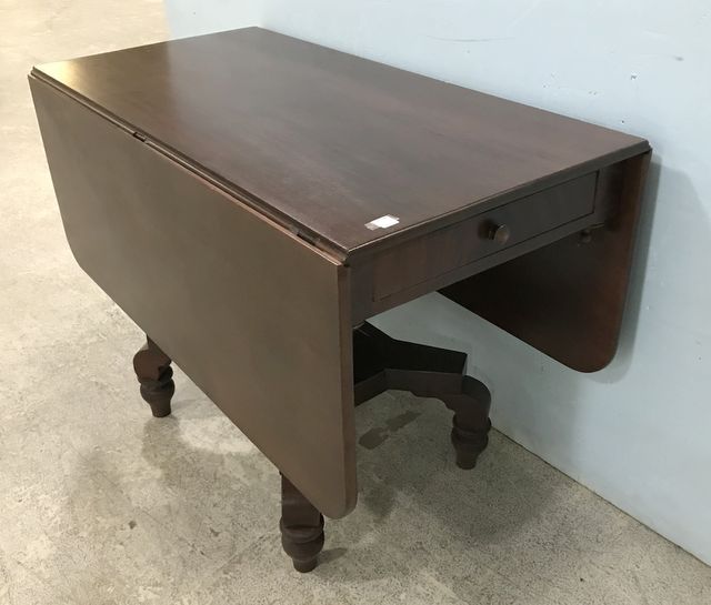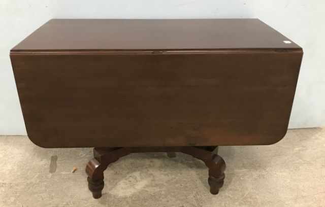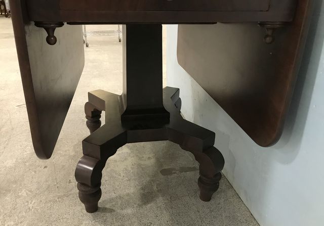 Vintage Drop Leaf Pedestal Table, mahogany, single drawer, pedestal base with added wood extension for height, good condition, 32"h., 46"d. Vintage Drop Leaf Pedestal Table, mahogany, single drawer, pedestal base with added wood extension for height, good condition, 32"h., 46"d.
