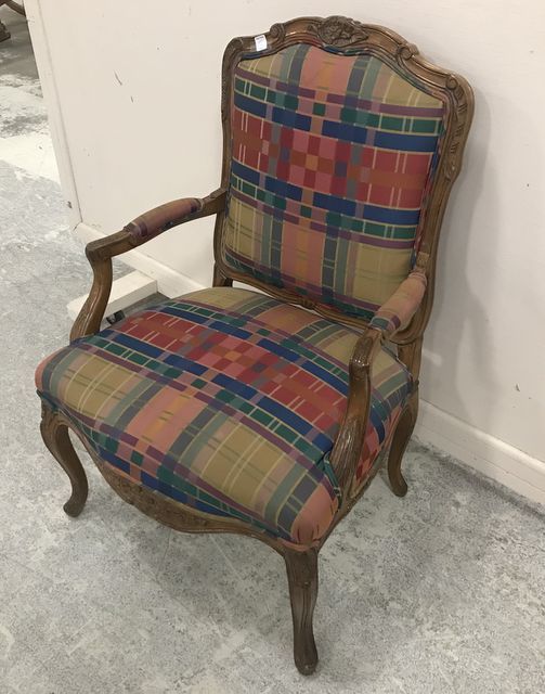 Country French Arm Chair, modern, upholstered seat and back, ornate carved designs, has finish wear, 38"h. Country French Arm Chair, modern, upholstered seat and back, ornate carved designs, has finish wear, 38"h.