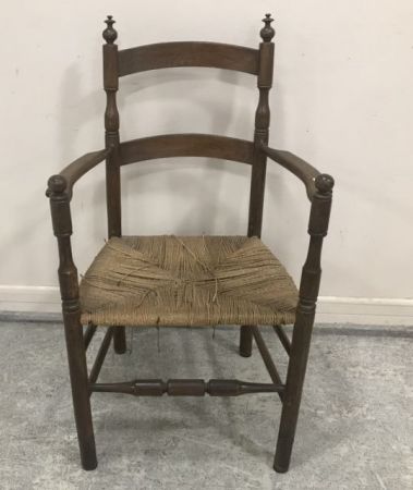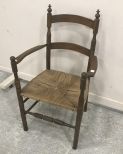 Antique Oak Gentleman's Arm Chair, golden oak, woven seat (has some damage), bottom stretchers, hand finials, 41"h. Antique Oak Gentleman's Arm Chair, golden oak, woven seat (has some damage), bottom stretchers, hand finials, 41"h.