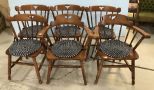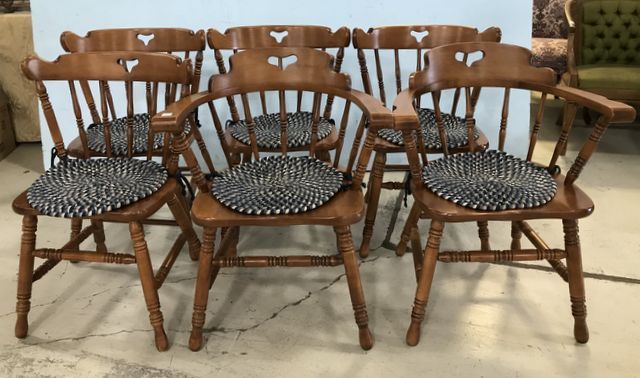 Six Tell City dinning chairs, two arms, four sides, spindle back, good condition, 32"h. Six Tell City dinning chairs, two arms, four sides, spindle back, good condition, 32"h.