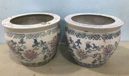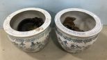 Pair of blue and white oriental porcelain planters, 10"h., 12"dia. Pair of blue and white oriental porcelain planters, 10"h., 12"dia.