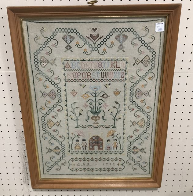 Alphabet Needle Point Sampler 1962, framed, signed A.H.A, 25"h., 19"w. Alphabet Needle Point Sampler 1962, framed, signed A.H.A, 25"h., 19"w.
