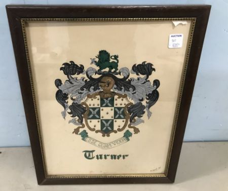 Pen and Painted Turner Family Crest, ESSE QUAM VIDER, by M. Kent 1950, framed 17"h., 13"w. Pen and Painted Turner Family Crest, ESSE QUAM VIDER, by M. Kent 1950, framed 17"h., 13"w.