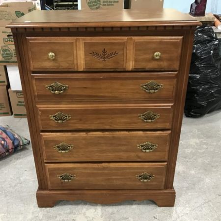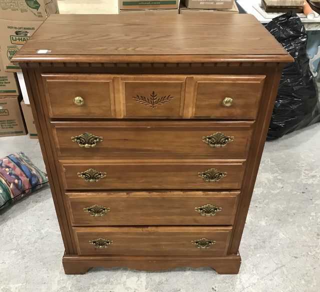 Broyhill Chest of Drawers, four drawers, working order, oak illuminate finish, 44"h., 34"w., 18"d. Broyhill Chest of Drawers, four drawers, working order, oak illuminate finish, 44"h., 34"w., 18"d.