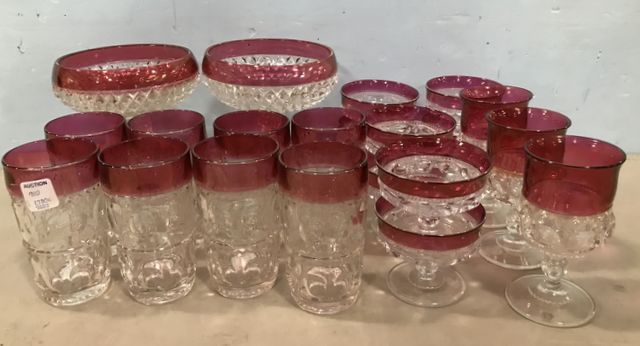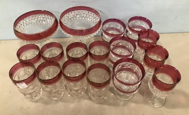 Set of Ruby red flash glass, diamond patterned compotes, ruby flash glass cups, sherbets, and goblets, 21 total. Set of Ruby red flash glass, diamond patterned compotes, ruby flash glass cups, sherbets, and goblets, 21 total.