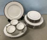 Theodore Haviland Partial China Set, white with silver rim, 8 dinner plates, 7 dessert plates, small platter, 6 cups. Theodore Haviland Partial China Set, white with silver rim, 8 dinner plates, 7 dessert plates, small platter, 6 cups.
