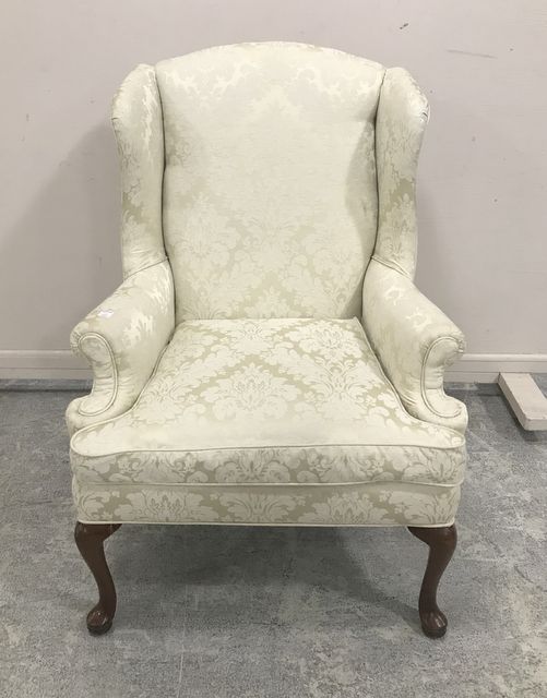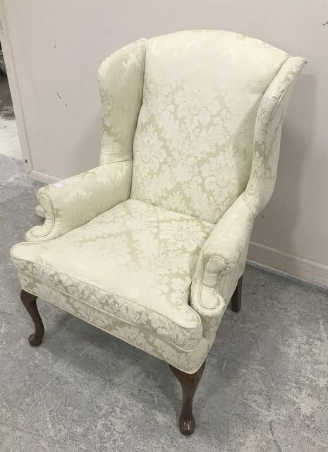 Upholstered Queen Anne Wing Back Chair, floral pattern, cherry legs, above average condition, 42"h. Upholstered Queen Anne Wing Back Chair, floral pattern, cherry legs, above average condition, 42"h.