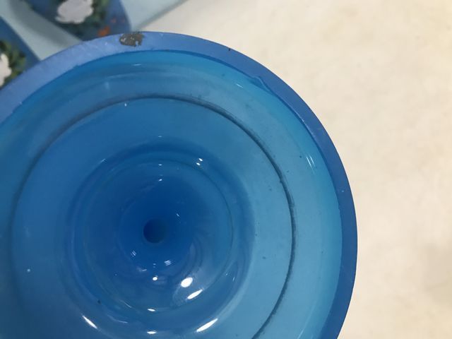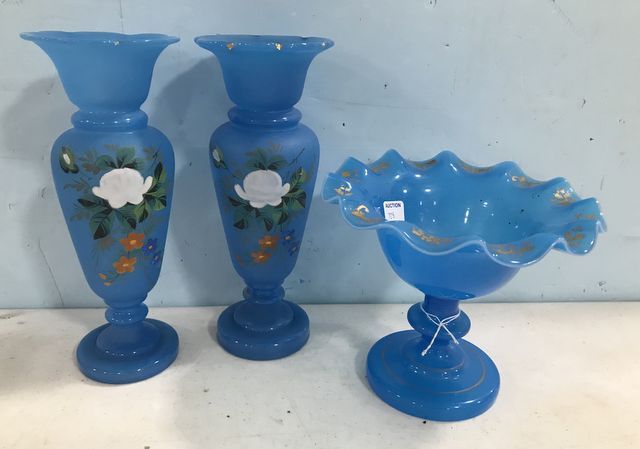 French Blue Bristol Glass Console Set, hand painted flower vase 10"h., compote, has small chip inner base. French Blue Bristol Glass Console Set, hand painted flower vase 10"h., compote, has small chip inner base.